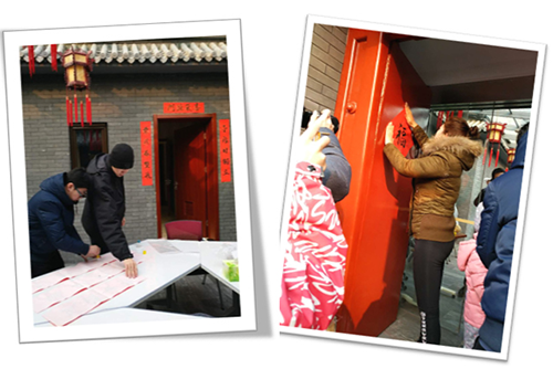 上午九时许,东四街道房管所的员工带着提前写好的春联和福字陆续走进公寓,拆开,铺平,抹胶水,一幅幅带着喜气的春联和福字被贴上。“有说有笑迎新春,无忧无虑度晚年”。顿时显得整个院子喜庆很多。