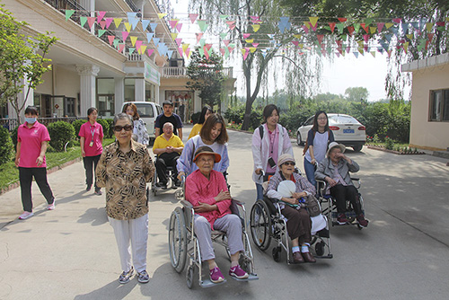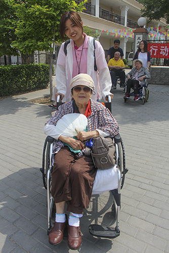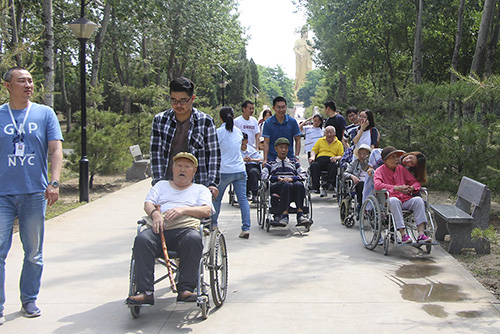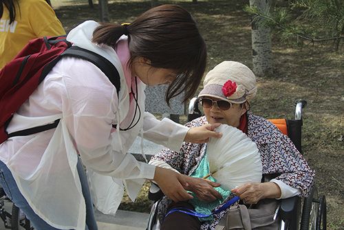 这次迈达斯的义工之行主要是带着入住公寓的护理型长者逛公园,散心怡情。因为护理型的长者大多身体、行动不便,大部门时间只能在公寓内行动。他们的到来帮助了爷爷奶奶门走出家门,欣赏大好风光。这下可把久居养老的爷爷奶奶高兴坏了,一大早都整装待发,迫不及待出发了。志愿者们推着爷爷奶奶,一边欣赏沿途的风景,一边聊着家常,看到这群年轻的孩子,爷爷奶奶们忍不住想起自己年轻时的模样。公寓的“老革命”和北京的帅气小伙聊起了那些年当兵的故事,从“老革命”的故事里我们能明白,和平友好的年代来之不易,幸福美好的生活要懂得珍惜。他的故事也让志愿者们肃然起敬,心生敬畏。