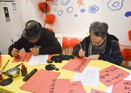 大集现场除了有理发、修脚、志愿者招募、旅游咨询等服务商,还有社区书法协会宛德清先生为大集猜灯谜环节写谜语,老人可以猜谜语得一个小灯笼,让大家感受元宵节的氛围。经常接受驿站服务的蔺奶奶看到宛德清先生写字她也来了兴致,坐到旁边也拿起笔写起了谜语,来咨询的居民看到说:“这字写得真好,笔劲有力,一看就是书法家,我也来猜一个”。大集过程中还有咱们驿站的长城艺术团成员即兴为大家助唱,表演了几首歌曲,引得大家齐齐拍手叫好。