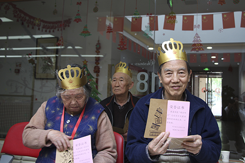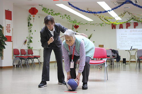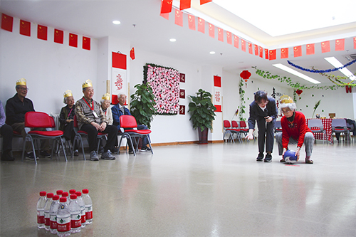 大家相互熟悉后,主持人就带爷爷奶奶进入“文斗”环节---猜猜猜,每人拿到一个卡片,卡片上写着自己所要描述的物品,通过自己的智慧向大家描述,为了让大家明白所表达的意思,表演者声行并茂地演绎,其他爷爷奶奶早已喜笑颜开了;经过“头脑风暴”后大家进入“武斗”环节———击球,爷爷奶奶们自行分为两组,在主持人的指导下击球,两组组员纷纷上场,最终积分高的小组获胜,获胜的团队得到精心制作的嘉奖卡片。爷爷奶奶在游戏后告诉我们喜欢这样同乐的感觉,无论得分是多少,重要的是团队在一起。