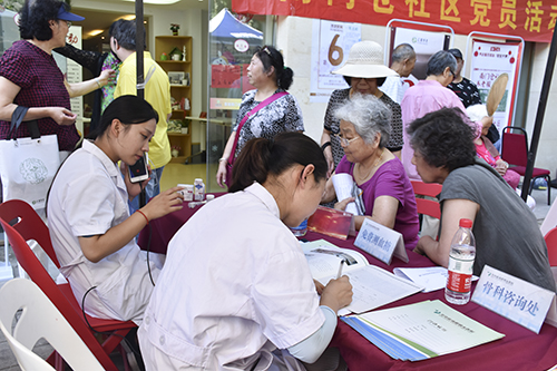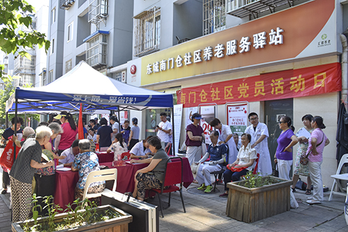 和往常一样,参加大集的各服务商在早上8点半的时候就陆陆续续来到了南门仓驿站大集。早上天气还不是太热,过往的居民看见了都纷纷过来问是干什么呢,得知今天大集会有很多为老服务单位提供宣传、咨询、现场体验等活动时,就赶紧把周围的邻居朋友也喊了过来,不一会驿站门口就聚集了很多社区老年人和居民。本次大集除了驿站,还有阳光家政、汇晨老年公寓、国安社区、农商银行、总院社区“邻里一家亲志愿理发服务队”等,特别是邀请到了前海股骨头医院、华都中医医院、春牙行动口腔义诊这三个医疗服务资源,为老人提供健康咨询、检测指导等医疗服务,受到老人的特别欢迎和青睐。因临近七一建党节,本次驿站大集与建党节相结合,与南门仓社区居委会一起合办了南门仓党员活动日,与社区居委会、东四社保所一起进行党员宣传、募集善款,充分发挥党员先锋模范作用,引领时代风尚。