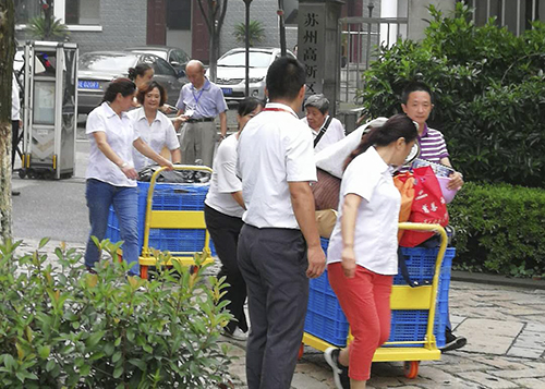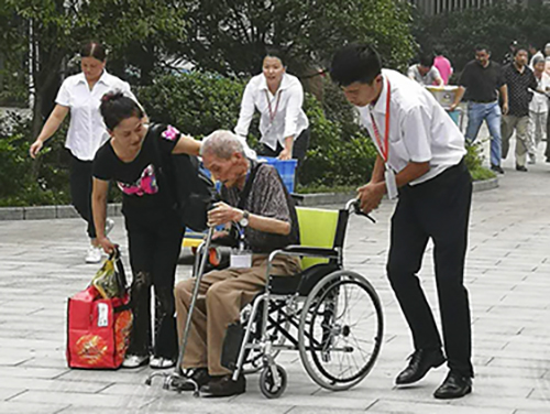 在搬迁中,长者身边随时都有公寓员工相助,院方还为身体不便的长者准备了轮椅,有的长者听不懂普通话,员工们就为他们充当“翻译”。
