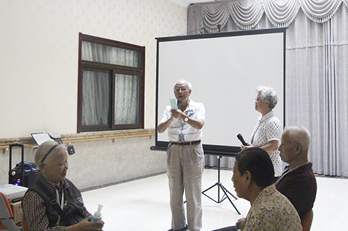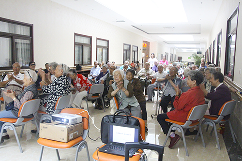 此次活动主要分为三部分:节目演出、知识竞赛、颁发奖品。活动开始前,大家聚集在大厅,在工作人员的协助下将爷爷奶奶每六人分为一组,大家一边看着幕布的内容,一边畅所欲言,一派不亦乐乎的景象。