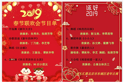 2019年1月29日,在两位主持人“激情四射”的主持下,2019年bat365正版唯一官网北京东城区老年公寓春节联欢会正式拉开帷幕。