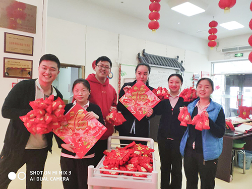 下午我们集福、送福的小精灵,将“福”字贴在房门上,带着大家共同的祝福一起迎福、接福,祈求“春至福临”。