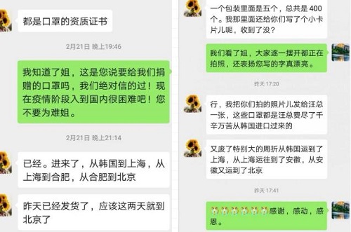 王怡是公寓511房间冯奶奶的女儿。由于疫情期间不能来公寓探望,护理部李主任经常向她发送奶奶的照片或视频,让她放心。在与李主任的聊天中,王怡多次表达对公寓深深的感谢,并表示要尽自己的一份微薄之力为公寓捐赠口罩。