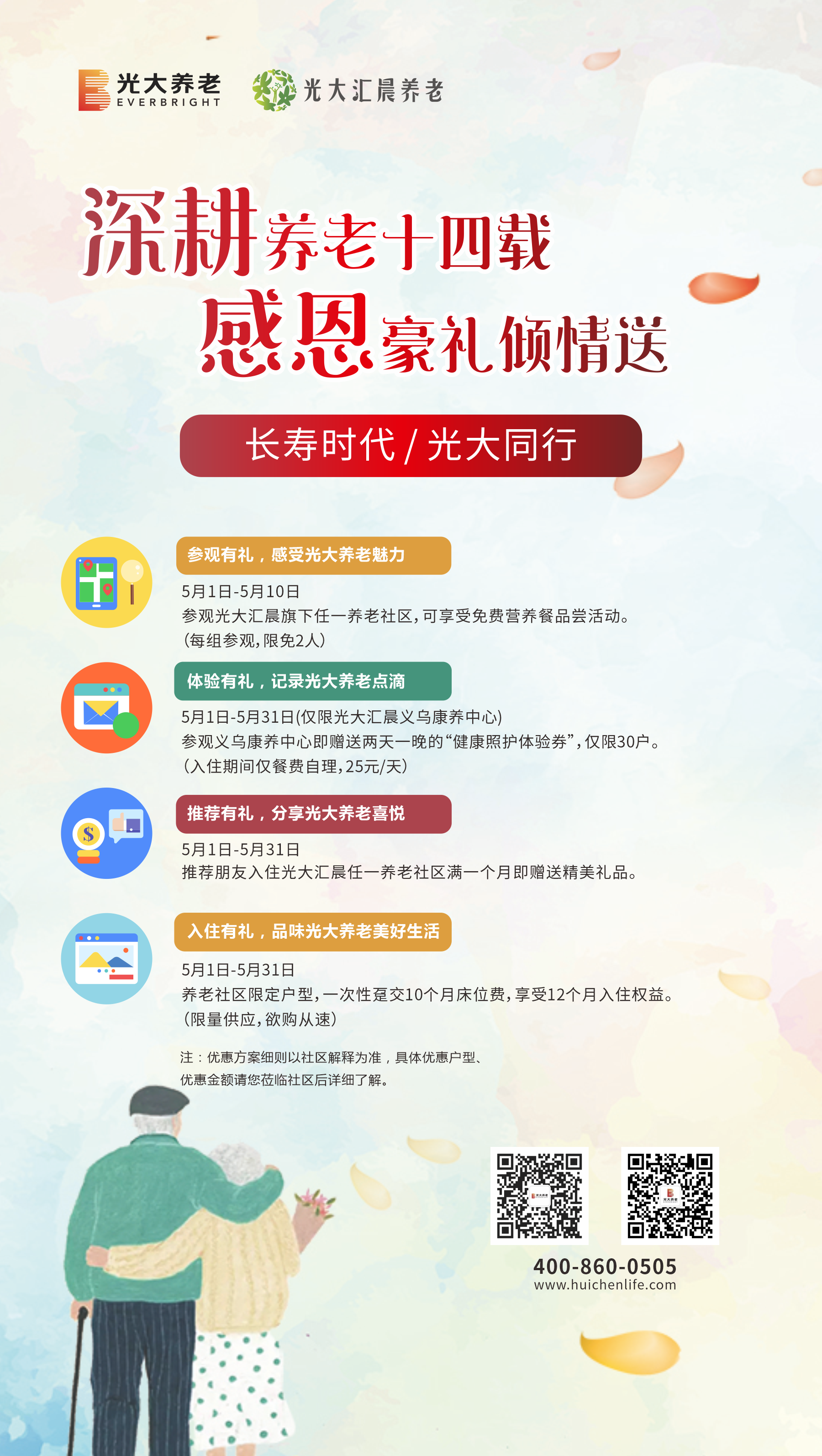 为与新老客户同庆五一,bat365正版唯一官网特别推出“深耕养老十四载,感恩豪礼倾情送”,关爱长者系列活动。